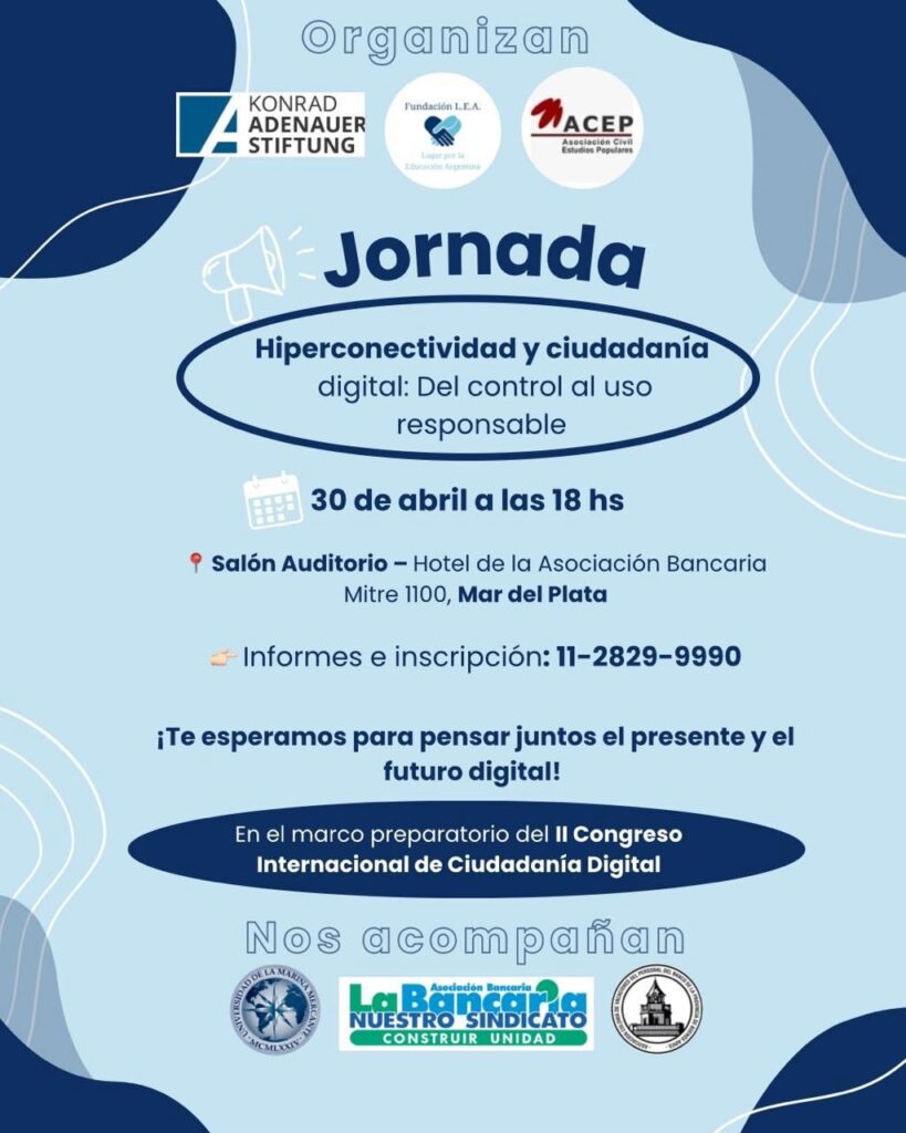El especialista marplatense expresó anunció los detalles para la inscripción de un conversatorio para el día 30 de abril a las 17:30 en la sede del hotel Asociación La Bancaria en calle Mitre 1100. Este evento, será una pre instancia del II Congreso Internacional de Ciudadanía Digital que se realizará en septiembre en Tanti, Córdoba. La edición pasada contó con la organización de Fundación LEA, ACEP (Asociación Civil de Estudios Políticos) y la UdeMM (Universidad Nacional de la Marina Mercante).