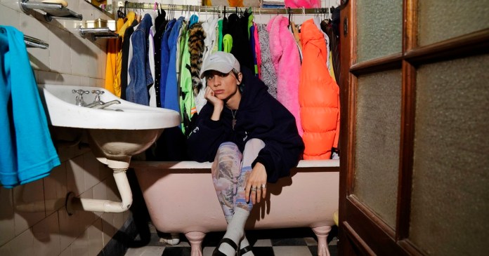 Clara Cava en un baño que convirtió en placard para colgar ropa. Foto Emmanuel Fernández «Siento que los años -cuenta- están pasando rápido últimamente y creo que cada vez van a pasar más rápido. Mi teoría es que cuando tenés dos años, un año es el 50% de tu vida, pero luego cada año es un porcentaje más pequeño de tu vida, entonces representa menos y por eso pasa más rápido».
