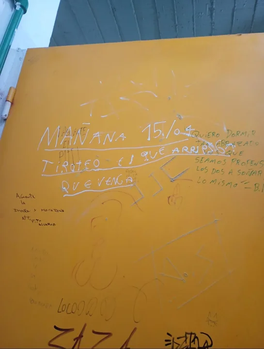 “Mañana 15/04 tiroteo, el que arriesga que venga”, se lee en una pared de fondo amarillo.