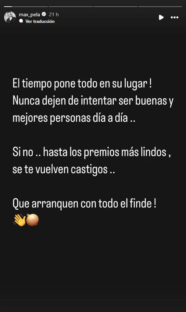 El exnovio de Juliana Díaz no dudó en dedicarle unas palabras en sus redes. “¡El tiempo pone todo en su lugar! Nunca dejen de ser buenas y mejores personas día a día… Si no, hasta los premios más lindos se te vuelven castigos…”, escribió el cordobés.