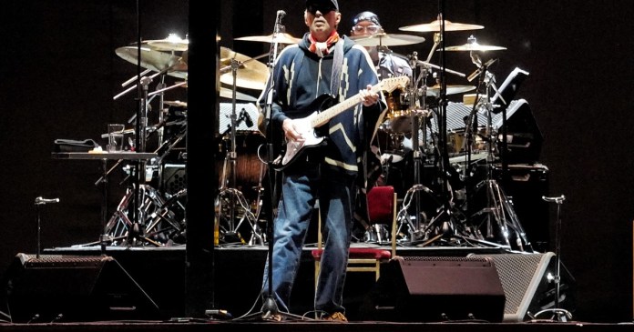 Eric Clapton, a los 79 años en vivo en Vélez, en su cuarta visita al país. Foto: Martin BonettoUn detalle especial de esta visita es que contó con dos grandes guitarristas como artistas invitados o teloneros. El crédito local fue David Lebón, de 71 años y una carrera ilustre con escalas en Pappo’s Blues, Pescado Rabioso y Serú Girán, antes de iniciar una carrera solista que le hizo ganar un Gardel de Oro.