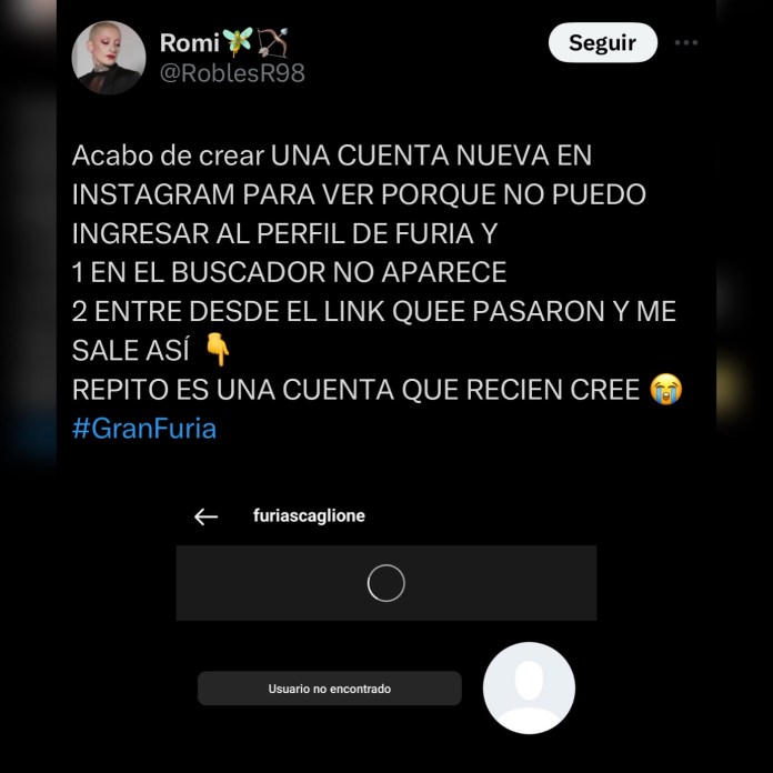 Una usuaria en X compartió su frustración: “Acabo de crear UNA CUENTA NUEVA EN INSTAGRAM PARA VER POR QUÉ NO PUEDO INGRESAR AL PERFIL DE FURIA Y 1 EN EL BUSCADOR NO APARECE 2 ENTRO DESDE EL LINK QUE PASARON Y ME SALE ASÍ, REPITO ES UNA CUENTA QUE RECIÉN CREÉ”.